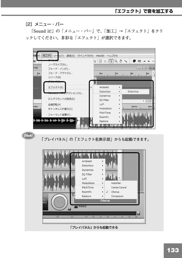 「Sound it!」にファイルを読み込む 編集範囲を選択する データ全体を選択する 任意の範囲を選択する 範囲指定に関するその他の機能 「アンドゥ」機能を使う 基本的な編集をする 編集作業の基本 各機能の役割 音そのものを加工する 音量を増幅する「ゲイン」 音量を最大化する「ノーマライズ」 音量を徐々に変化させる「フェード」 逆再生させる(リバース) 無音部を挿入する(ブランク) 「Sound it!」でノイズを除去する 「DCオフセット」を除去する 「ノイズリダクション」を使う 「エフェクト」で音を加工する データ自体を加工する データに手を加えず「エフェクト」をかける