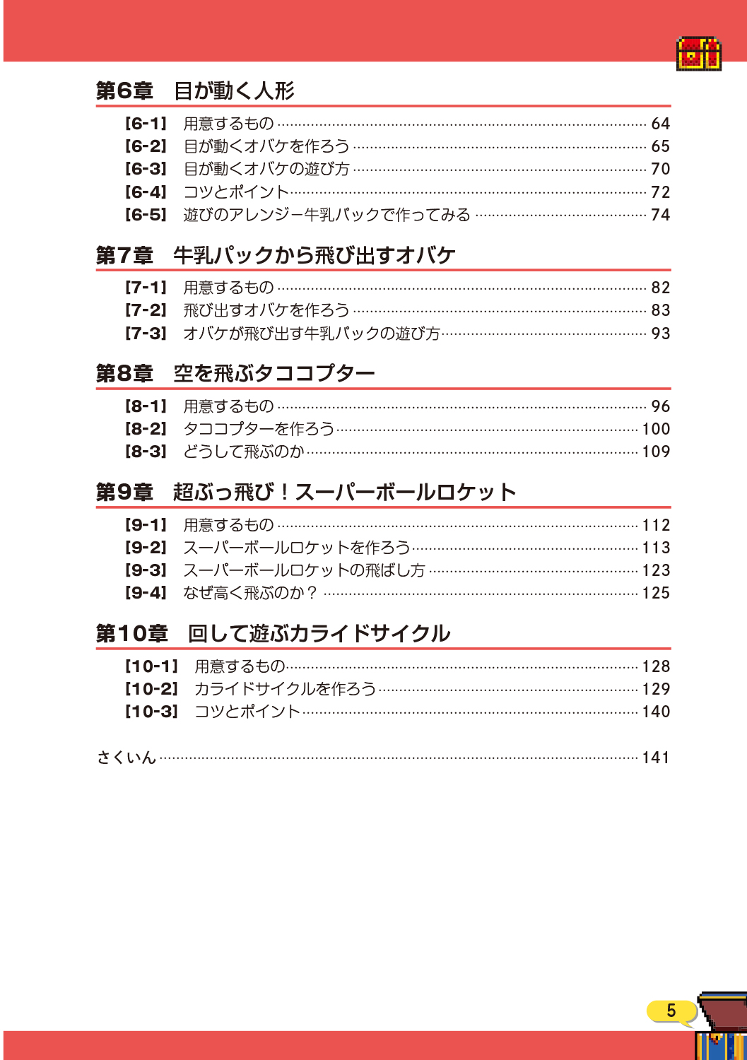 本書では、ヘビが飛び出すびっくり箱や吹くと音が鳴るストロー、刺すと引っ込むおもちゃのナイフなどの、パっと見ただけではどういう仕掛けがあるか分からないびっくりおもちゃの作り方を紹介します。