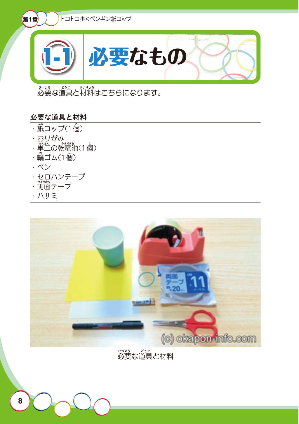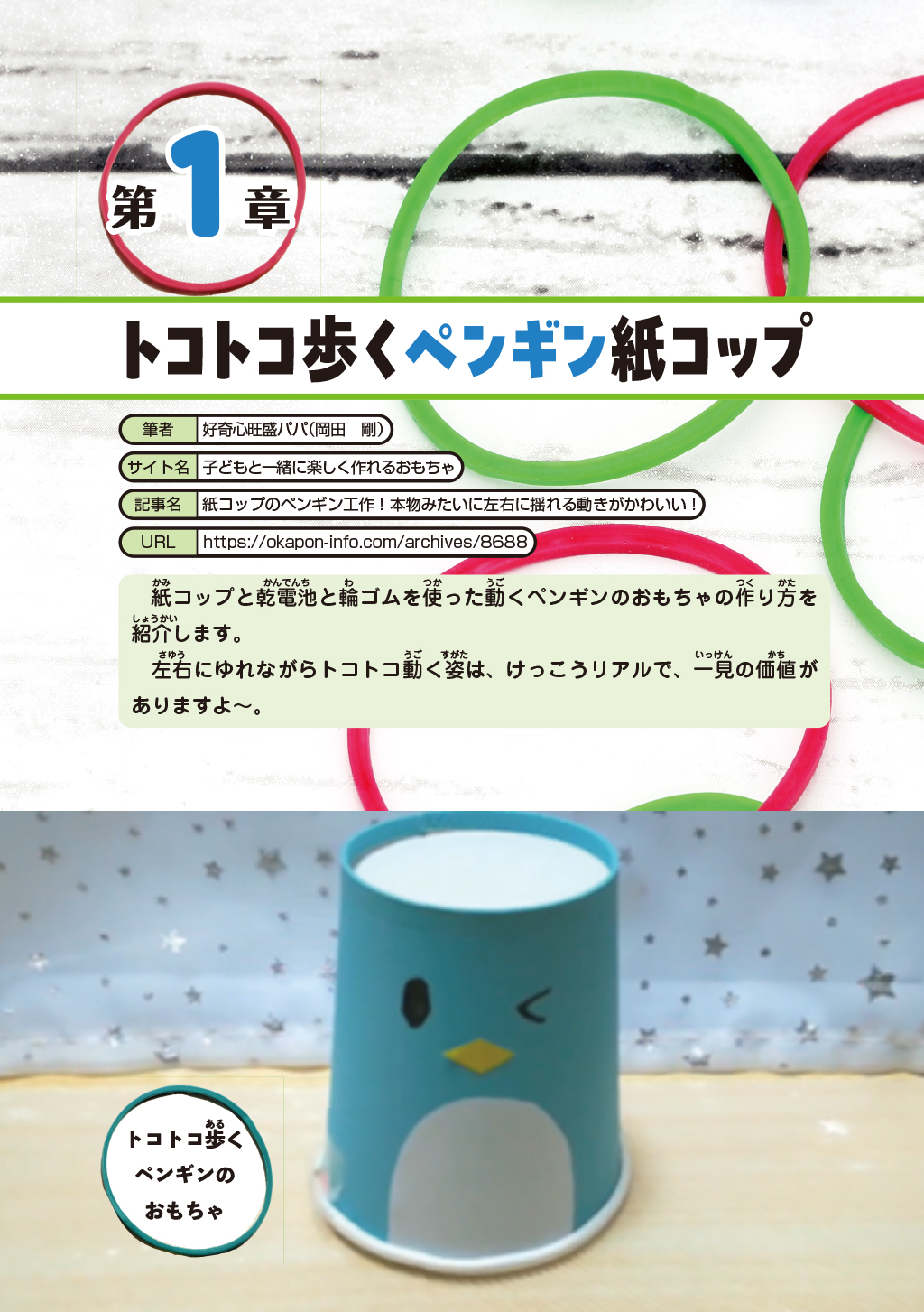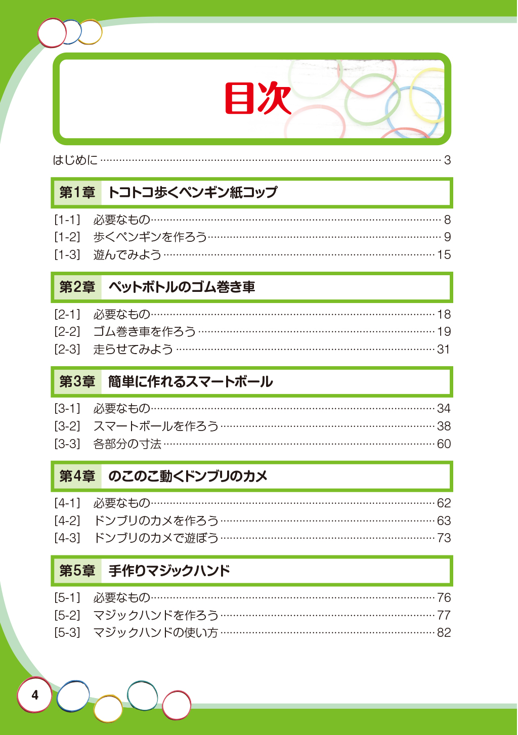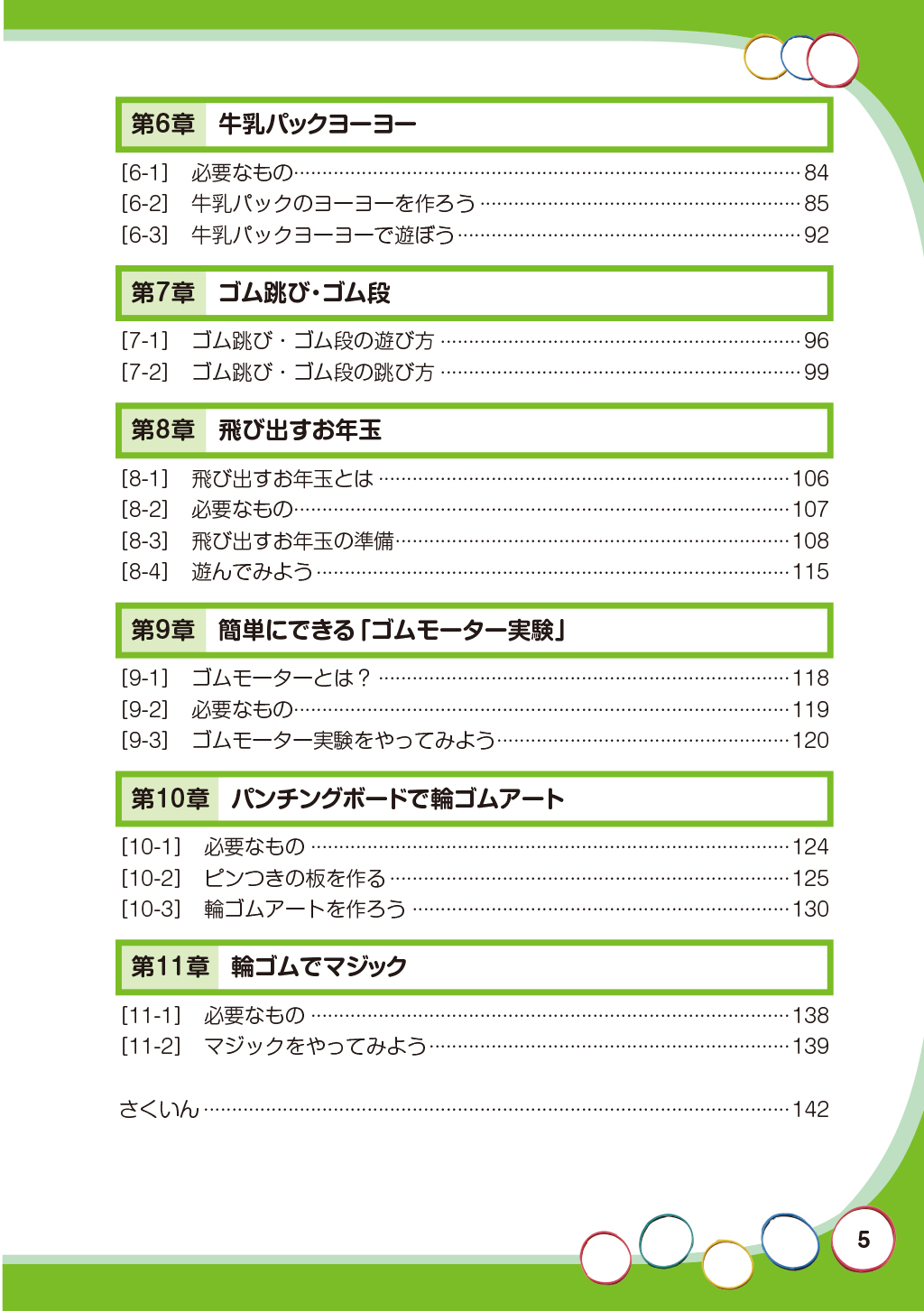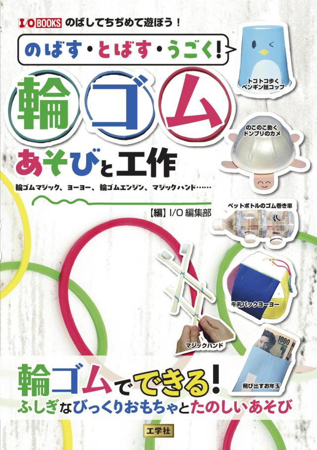 指にかけた輪ゴムが入れ替わるマジックや、パターンボードに輪ゴムを引っかけて作る輪ゴムアート、ゴム跳びなどの輪ゴムを使ったあそびや、熱の力で回る輪ゴムエンジン、輪ゴムの力で走る車、跳ね回る輪ゴムヨーヨーなどの輪ゴムを使った工作の作り方を紹介します。家にある材料を使っているため、思い立ったらすぐにあそぶことができます。