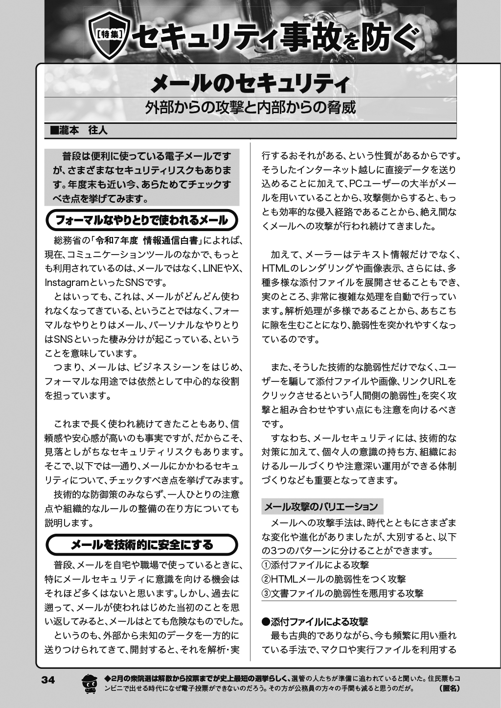 ¡¡ËÜÆÃ½¸¤Ç¤Ï¡¢¤³¤Î¤è¤¦¤Ê¥»¥¥å¥ê¥Æ¥£»ö¸Î¤òËɤ°¤¿¤á¤ÎÊýË¡¤ò¾Ò²ð¡£ÉÔÍ×¥¢¥«¥¦¥ó¥È¤òÊüÃÖ¤¹¤ë¥ê¥¹¥¯¤ä¥Ñ¥¹¥ï¡¼¥É¤Î»È¤¤²ó¤·¤¬¾·¤¯¾ðÊóϳ±Ì¤Î´í¸±¤Ê¤É¤Ë¤Ä¤¤¤ÆÀâÌÀ¤·¤¿¾å¤Ç¡¢¥á¡¼¥ë¤Î¥»¥¥å¥ê¥Æ¥£ÌäÂê¤ä¥¯¥é¥¦¥É¥µ¡¼¥Ó¥¹ÍøÍÑ»þ¤ÎÃí°ÕÅÀ¡¢¼ÒÆâ³°¤Ë¾ðÊó¤ò»ý¤Á½Ð¤¹¤È¤¤äüËö¤Î¾ùÅÏ»þ¤Ëµ¤¤òÉÕ¤±¤ë¤³¤È¤Ê¤É¡¢¥»¥¥å¥ê¥Æ¥£»ö¸Î¤òËɻߤ¹¤ë¤¿¤á¤ÎÊýºö¤ä¥Þ¥¤¥ó¥É¥»¥Ã¥È¤ò²òÀ⤷¤Þ¤¹¡£